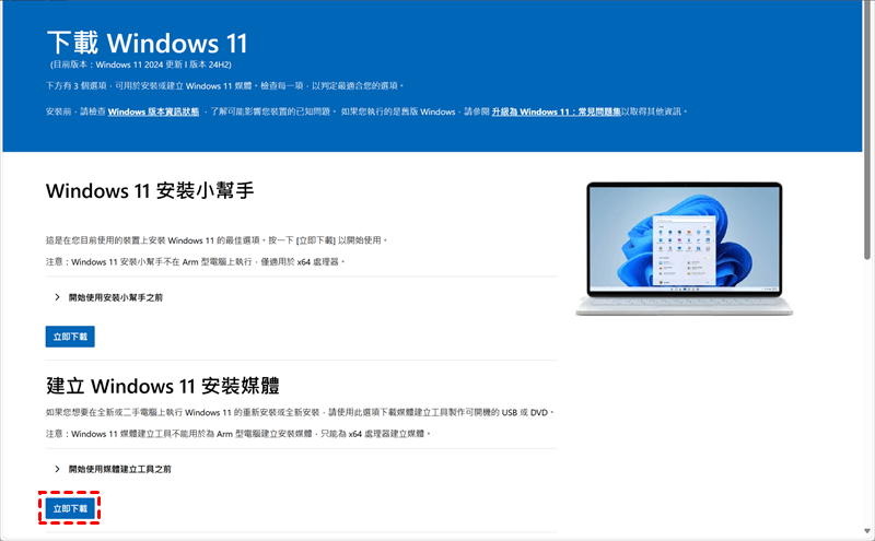步驟 1. 到微軟官方下載頁面,找到「建立 Windows 11 安裝媒體」,點擊下載。下載完成後,點兩下開啟。