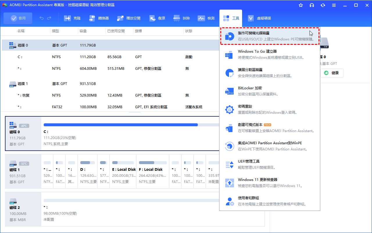 步驟 1. 將 US B連接到正常工作的 Windows 11 電腦,安裝並運行AOMEI 分割區軟體 。點選上方工作列「工具」——「製作可開機光碟」。