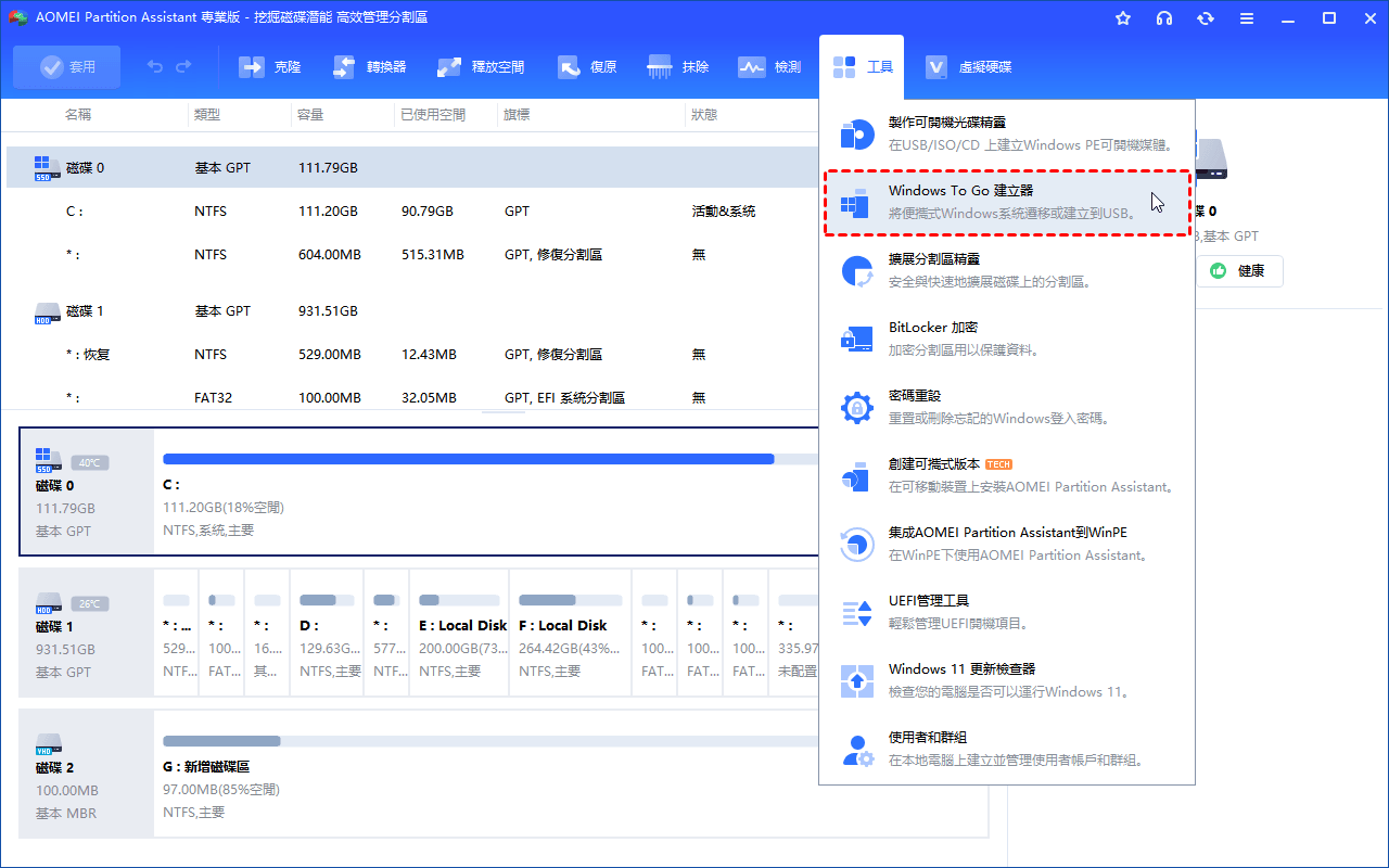 步驟 2.安裝並啟動 AOMEI 分割區軟體,點選上方工作列「工具」——「Windows To Go 建立器」。