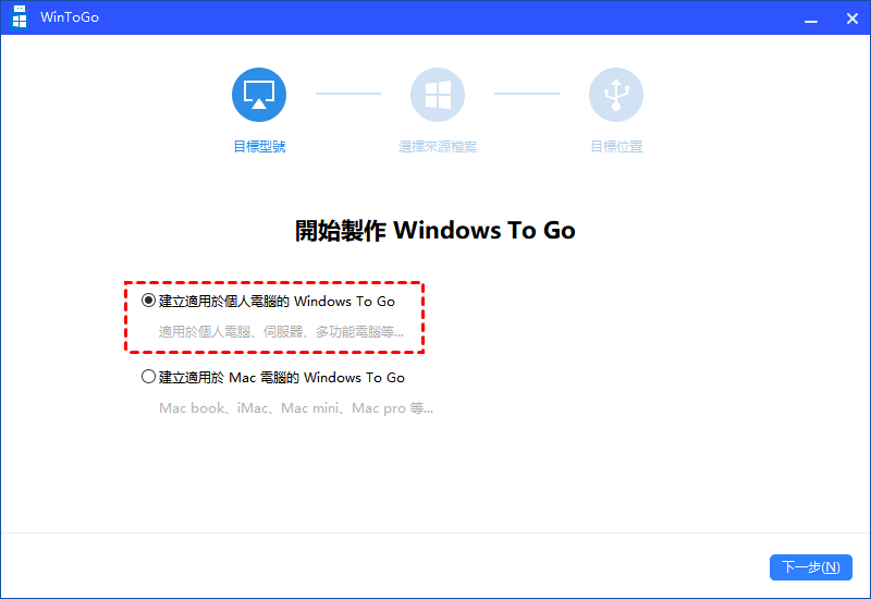 步驟 3.選擇第一個選項「建立適用於個人電腦的 Windows To Go」。點選資料夾圖示,手動選擇 ISO。之後,點選「下一步」繼續。
