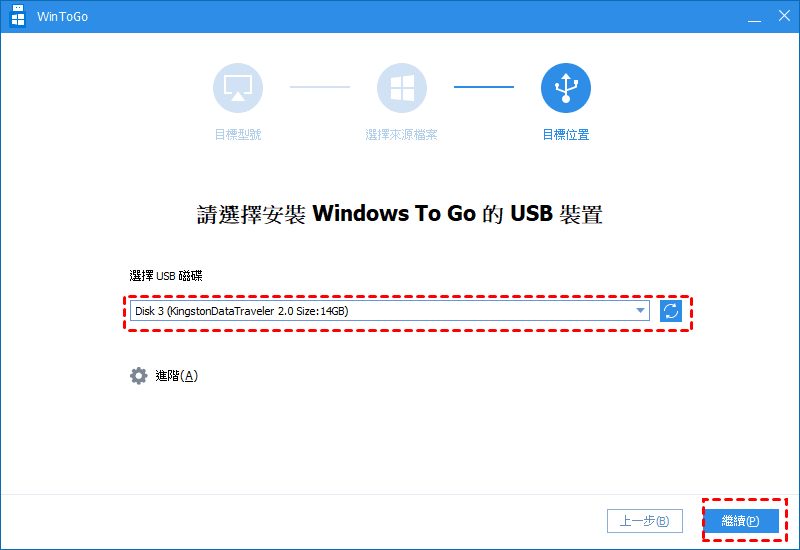 步驟 5.在此處選擇目標USB,然後點選「繼續」。