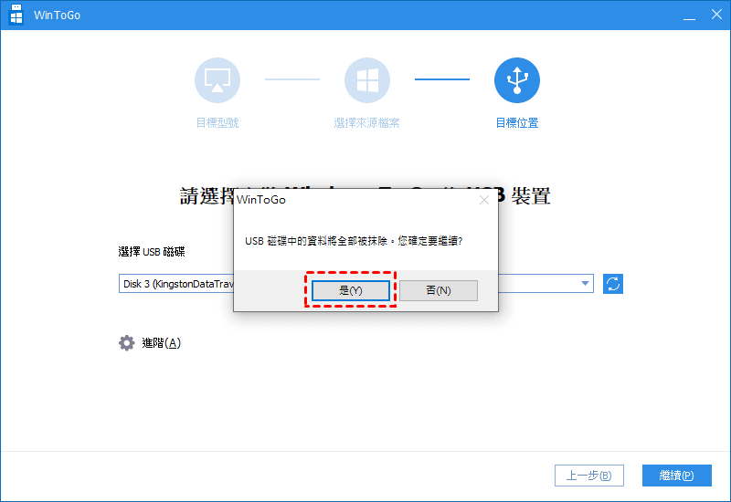 請注意,您會收到一個提示:選擇的 USB 裝置將被格式化,請備份重要資料。如果您已經這樣做了,請點選「是」。