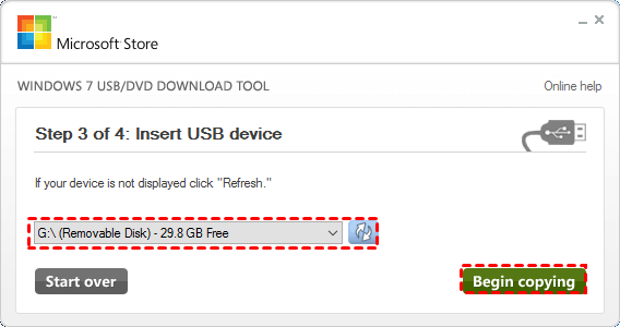 步驟4. 在下拉清單中選取您的 USB 隨身碟,點選「Begin copying」。