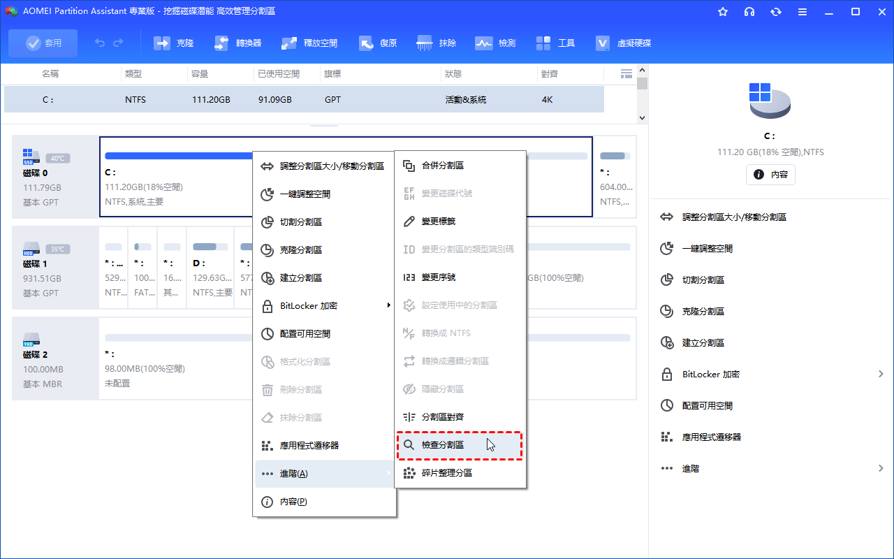 (1)開啟 AOMEI 分割區軟體。右鍵系統分割區,選擇「進階」>「檢查分割區」。