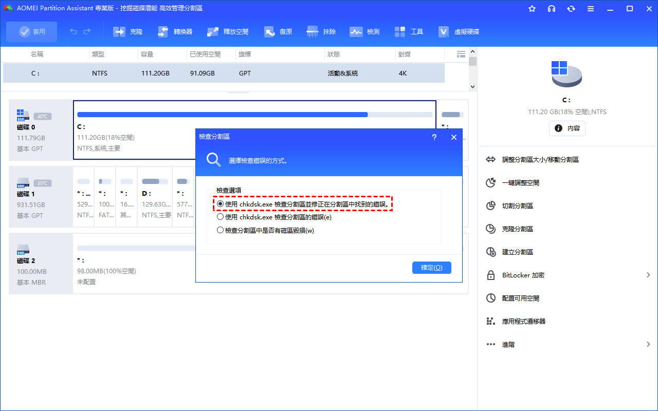 檢查並修復分割區