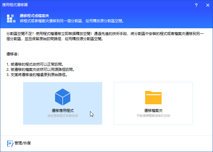 在升級到 AOMEI 分割區軟體的進階版本後,您可以使用更多功能。以【應用程式遷移器】為例,它可以幫助您快速且完整地遷移一個或多個應用程式到其他硬碟,可確保遷移後的應用程式能夠直接使用。