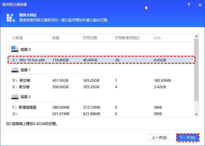 步驟 3.您的所有分割區將在視窗中列出,每個分割區上安裝的應用程式的容量和大小也將顯示。選擇一個要從中移動應用程式的分割區,然後點擊「下一步」。