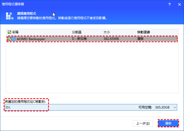 步驟 4.將列出所選分割區中的所有可移動應用程式,選擇要移動的應用程式並選擇目標位置,然後點擊「轉移」。