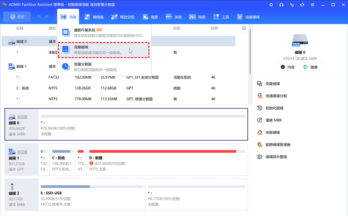 步驟1. 安裝並運行AOMEI 分割區軟體,點選上方「克隆」——「克隆磁碟」。