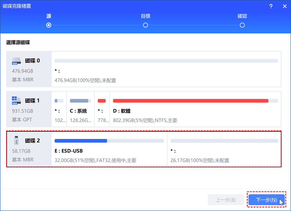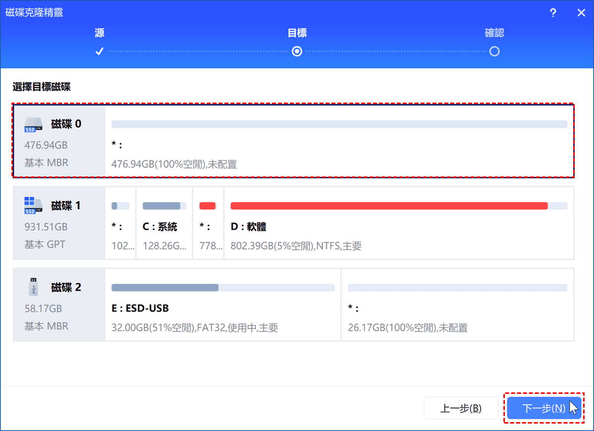 步驟3. 選擇目標磁碟,再點選下一步。