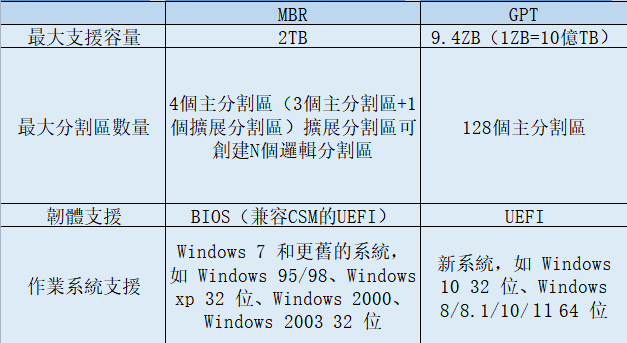 MBR 最多只能切 4 個主分割區,如果還想要更多,就得把其中一個設為延伸分割區,再往裡頭切邏輯分割區。而 GPT 就沒這個限制,可以直接建立超過 4 個主分割區,靈活很多。