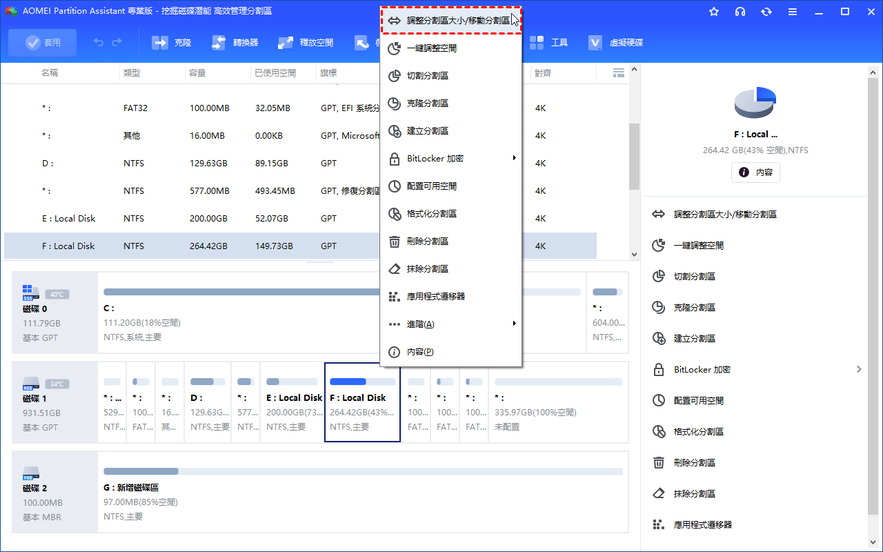 步驟1.安裝並運行 AOMEI 分割區軟體。右鍵點擊您想移動的磁區,然後選擇“調整分割區大小/移動分割區”。