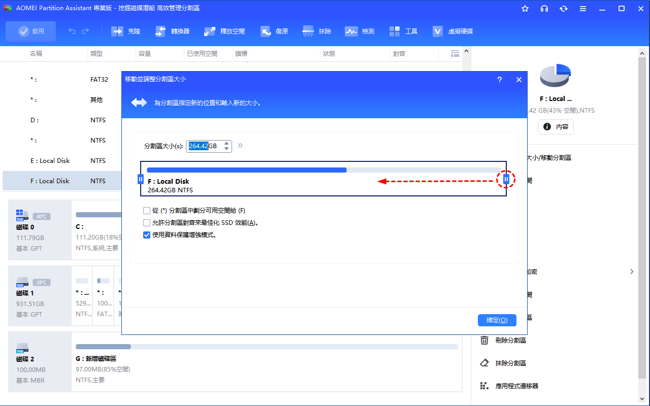 步驟2. 把滑鼠的光標移動到選擇的分割區的右側滑塊,按住滑鼠左鍵,把它向左拖拽。拖到適當的位置,然後點選“確定”。