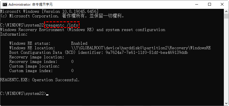 步驟 2. 輸入以下指令檢查 WinRE 狀態: