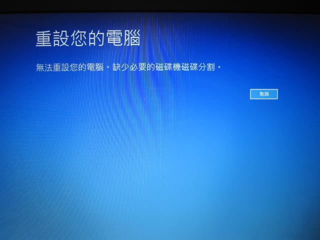 - 若電腦是透過「全新安裝」而非原廠還原映像安裝 Windows,且未手動建立復原分割區,系統預設可能缺少重設所需的來源檔案。