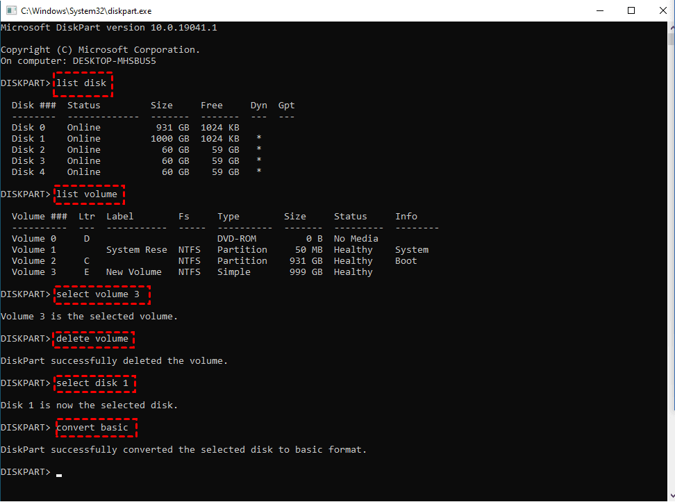 - 這個方法就需要您先使用磁碟管理刪除磁碟區,然後使用Diskpart命令完成轉換。