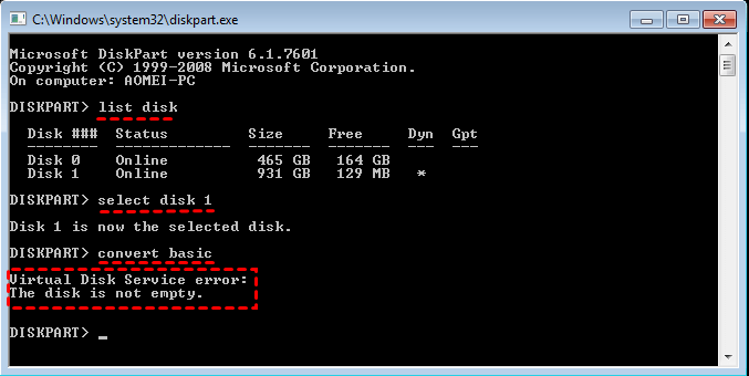 當您嘗試將動態磁碟轉化為基本磁碟時,可能會有報錯提示——磁碟非空。因此,如果基本磁碟能滿足你的所有需求,建議您最好不要將基本磁碟轉換為動態磁碟。