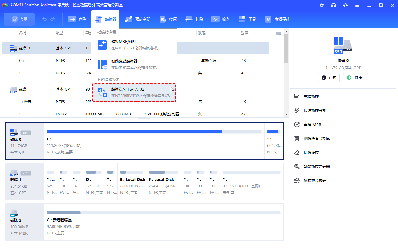 - 靈活的磁碟轉換工具:無需刪除分割區即可在 MBR 與 GPT 之間進行轉換,可在基本磁碟與動態磁碟之間切換,並能轉換 NTFS 與 FAT32 檔案系統。