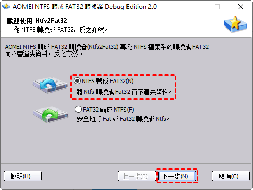 步驟2、 在彈出視窗中,選擇把 FAT32 轉換到 NTFS 選項,然後點擊下一步。