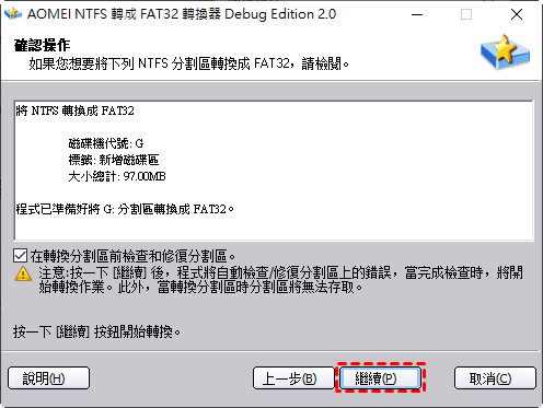 步驟4、您會收到程式的建議:在點擊“執行”之前,使用chkdsk.exe去檢查并修復您的分割區。當一切就緒,您可以點擊“繼續”按鈕,隨後,轉換器精靈將會引導您一步一步進行操作。